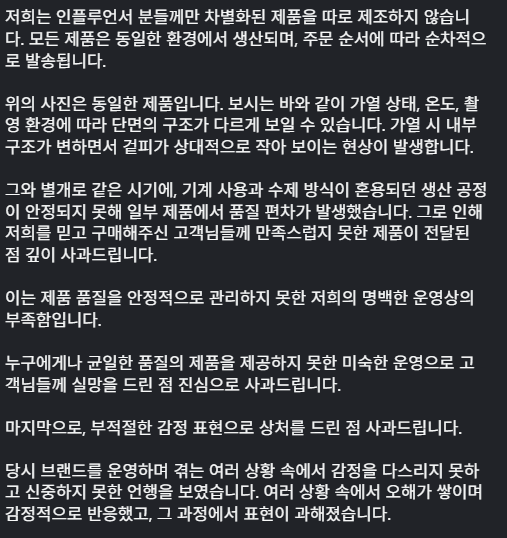 브랜드 측 입장 – “공정 문제 일부 인정”