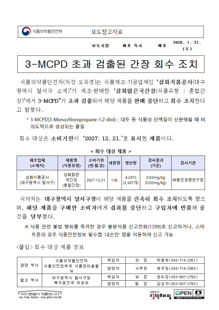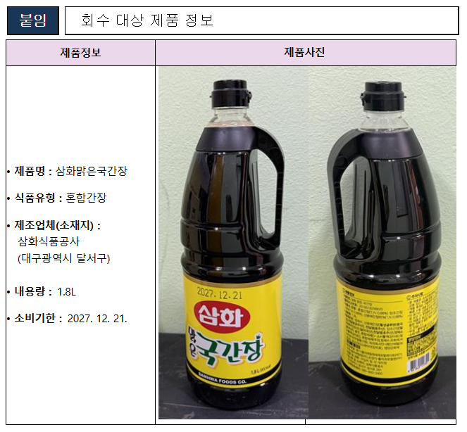 식품의약품안전처는 **‘삼화맑은국간장(혼합간장)’**에서