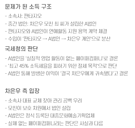 차은우의 소득 구조에 **모친 명의의 법인(A법인)**이 개입된 점이다.