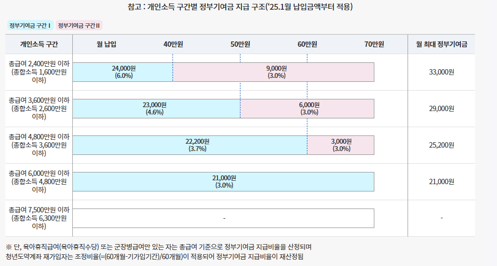 - 연 소득 2,400만 원 이하: 정부기여금 최대