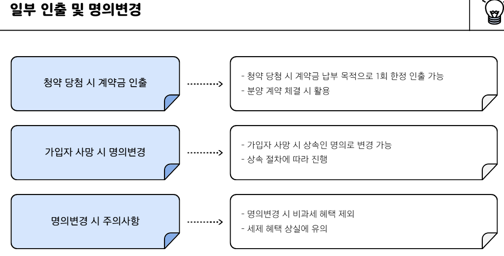 - 청약 당첨 시 계약금 납부 목적 1회 한정 인출 가능