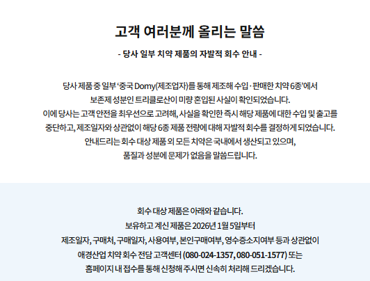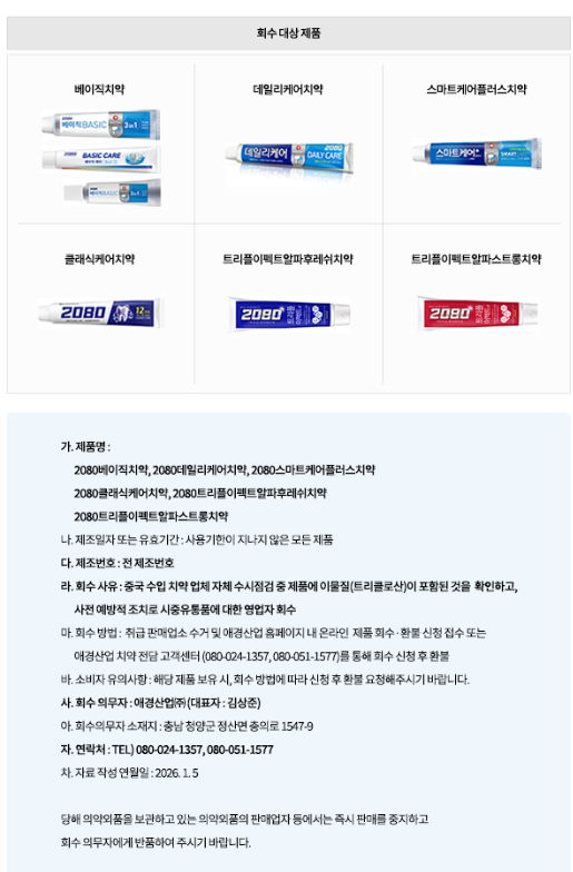 - 2080 치약 리콜은 특정 6종 전량 대상